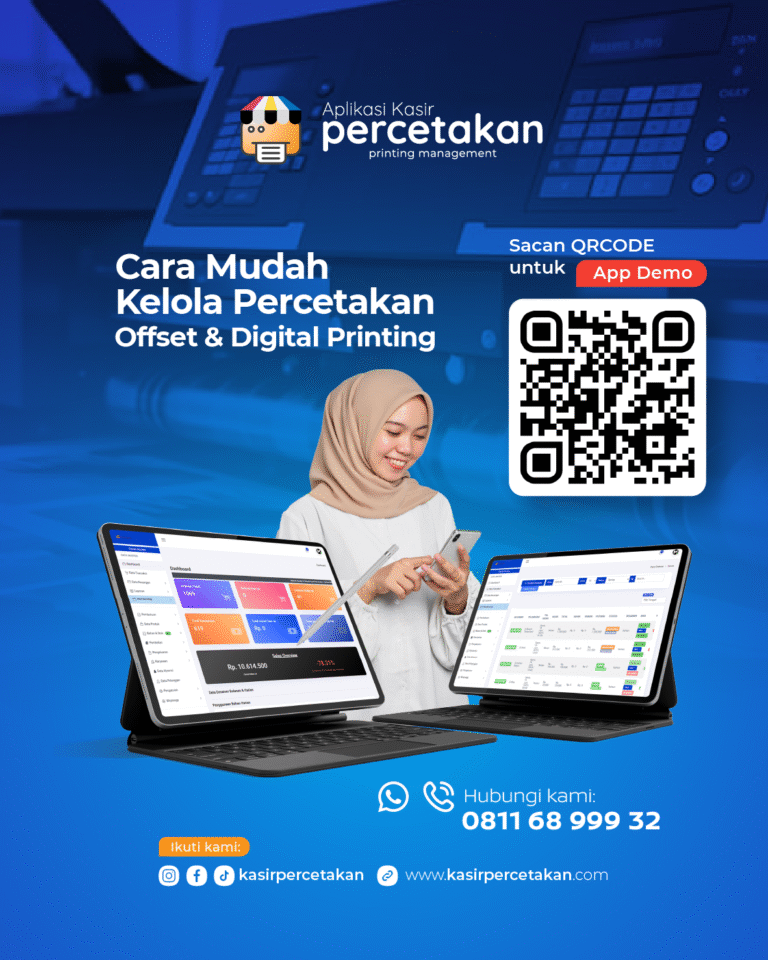 Dengan tampilan modern seperti pada poster promosi KasirPercetakan—dilengkapi QR code demo, antarmuka dashboard yang bersih, dan visual profesional—aplikasi ini tidak hanya memudahkan operasional, tetapi juga meningkatkan citra bisnis di mata pelanggan.